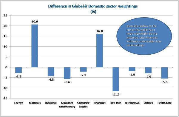 It is well-known that the Australian share market represents a small portion of the global universe (around 3% as measured by the MSCI index). Our share market is highly concentrated in a few sectors and a handful of companies. The resource and banking sectors comprise over 60% of our market and the top 10 stocks represent 52% of the index (S&P/ASX 200 Index). The biggest company BHP alone makes up 13% of the index. This is illustrated in the graph below which shows the extent of over-exposure and under-exposure of Australian shares in various sectors relative to international shares.This high level of concentration in Australian shares means that investors are prone to shocks or underperformance affecting these key sectors and companies. This may derive from such things as legislative changes and/or events such as a sharp slowdown in China’s economy. |