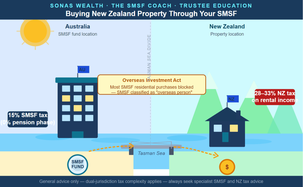 Geographic diversification — exposure to a different property market can reduce concentration risk in an all-Australian portfolio.Overseas Investment Act restrictions — an SMSF is almost certainly classified as an ‘overseas person’ and cannot purchase most existing NZ residential property without OIO consent.