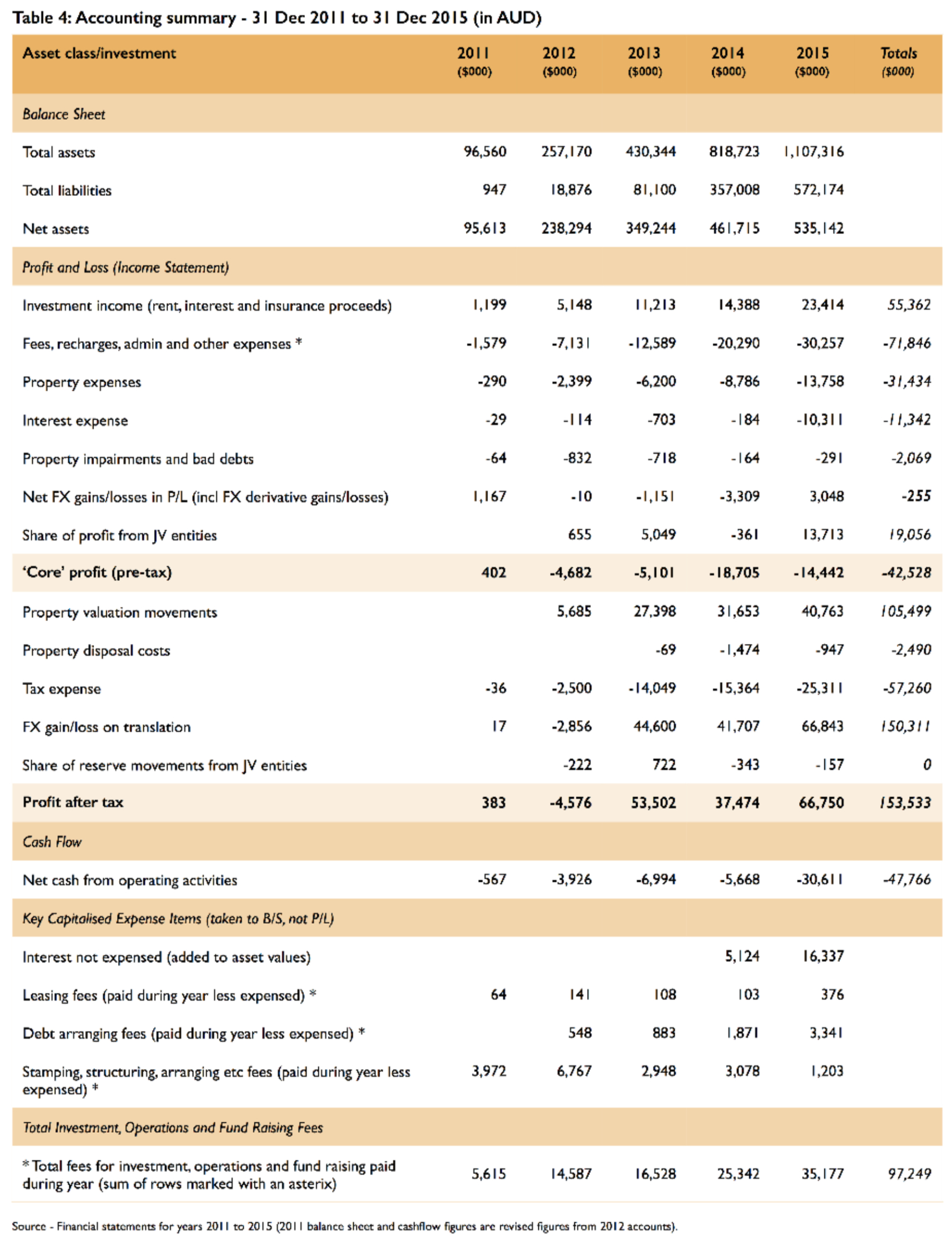 So there you have it: the fund is an extraordinarily expensive cash burner. However, the fund has survived and prospered, largely on the back of three critical factors: property revaluations, foreign exchange gains and the ability to regularly source new capital and borrowings.