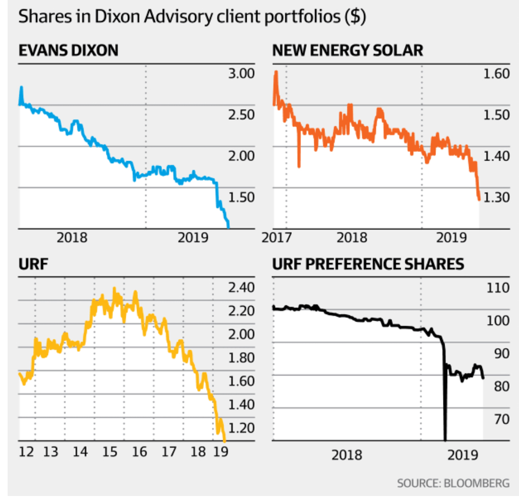 The Australian Financial Review has released an article (behind paywall) today focusing on poor performance of Evans Dixon’s internal funds marketed heavily to many of their clients. The main focus is on the fall in value of their own stock but equally on the heavily fee laden products such as US Masters Residential Property Fund (URF).
