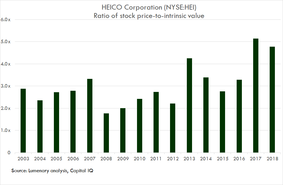 Although the intrinsic value of HEICO’s business has consistently increased over time, the increase in it’s price has far outpaced the fundamental growth of the company. HEICO is a solid and growing company, but its impressive performance has been driven primarily by sentiment and price, rather than actual business value. The price-to-intrinsic value ratio shows this.