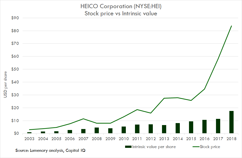 During the GFC, Mr Market was very pessimistic. He was only willing to pay 1.8x the intrinsic value of HEICO. But alas Mr Market is as fickle as they come. More recently, he has been very bullish. He’s willing to pay 4.8x intrinsic value. A large proportion of the returns have been driven solely by the company’s increasing popularity with investors.